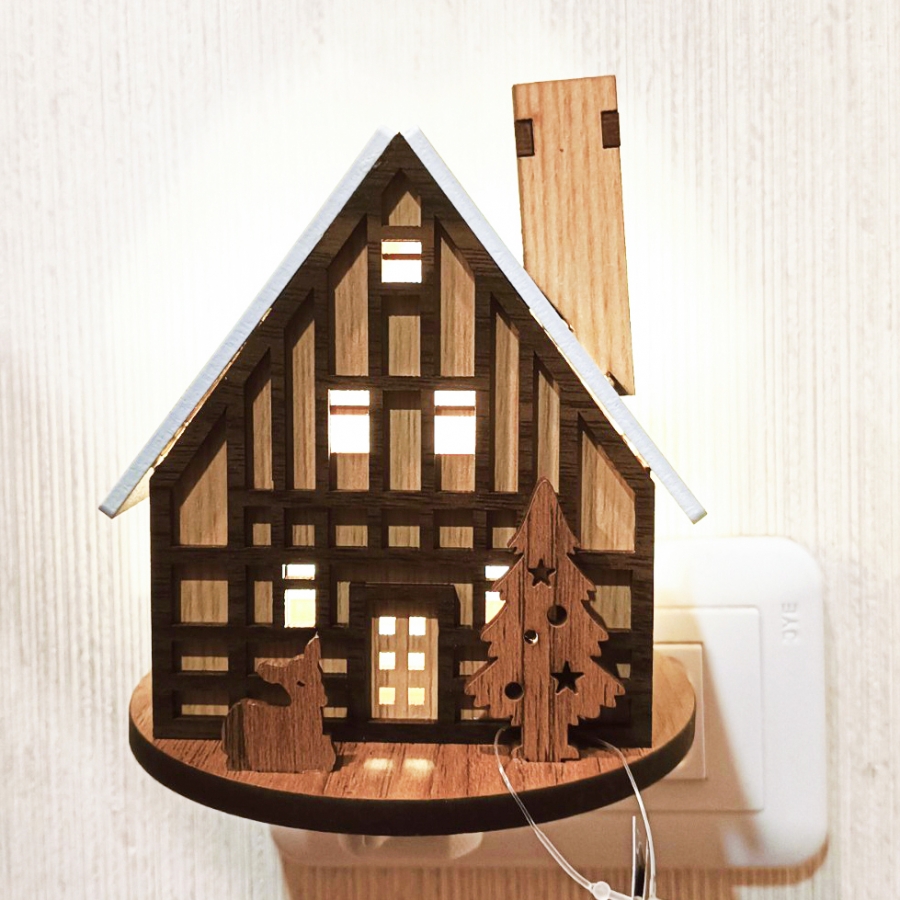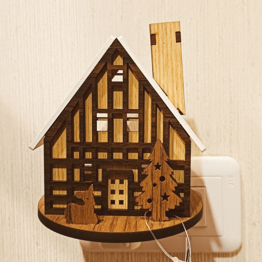精湛工藝: 由多種不同色澤的木材拼接而成,呈現出豐富的層次感和細膩的紋理。 木屋前還有一個小木製聖誕樹和一個小動物剪影,增添了節日氣氛和童趣。